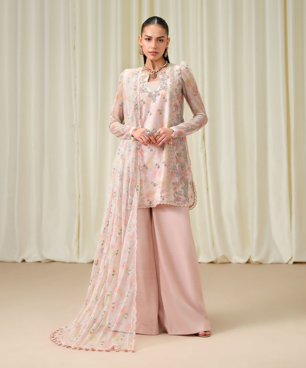 Blended Net Embroidered Pink 3 Piece Suit