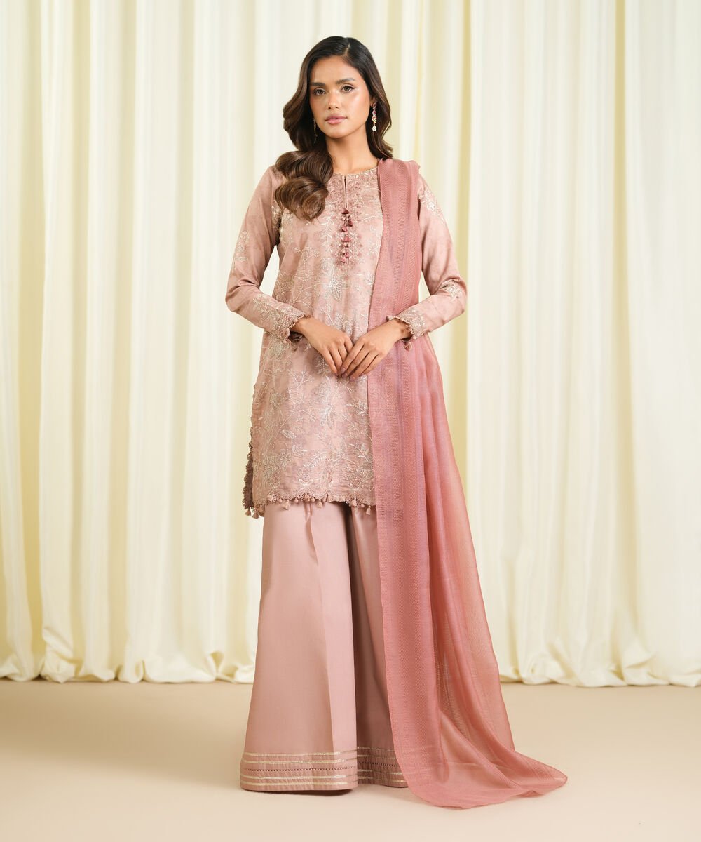 Cotton Jacquard Embroidered Pink 3 Piece Suit